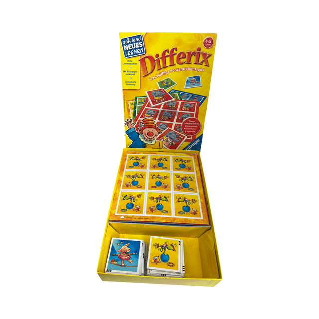In dem Kinderspiel "Differix" heißt es Manege frei und aufgepasst! Schaut der Clown nach rechts oder nach links? Ist sein linkes oder rechtes Hosenbein blau? Die scheinbar gleichen Bilder unterscheiden sich nur im Detail. Nur wer genau hinschaut kann die Unterschiede sehen. Jedes Kind hat eine Legetafel mit den entsprechenden Kärtchen. Bild für Bild wird nun geprüft, wo der richtige Platz auf der Legetafel ist. Wer das fehlerfrei schafft, gewinnt das knifflige Konzentrationsspiel.